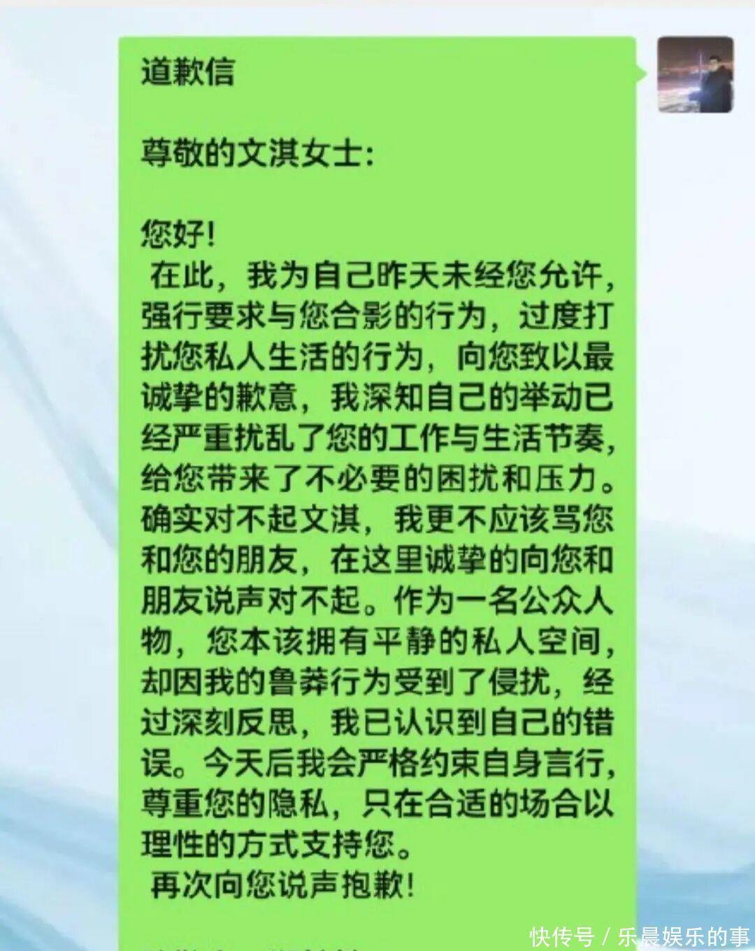截至目前,文淇方面还未回应这份道歉,也没有确认该名网友是否就是视频中的男子。