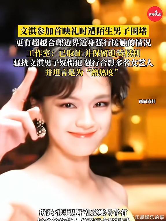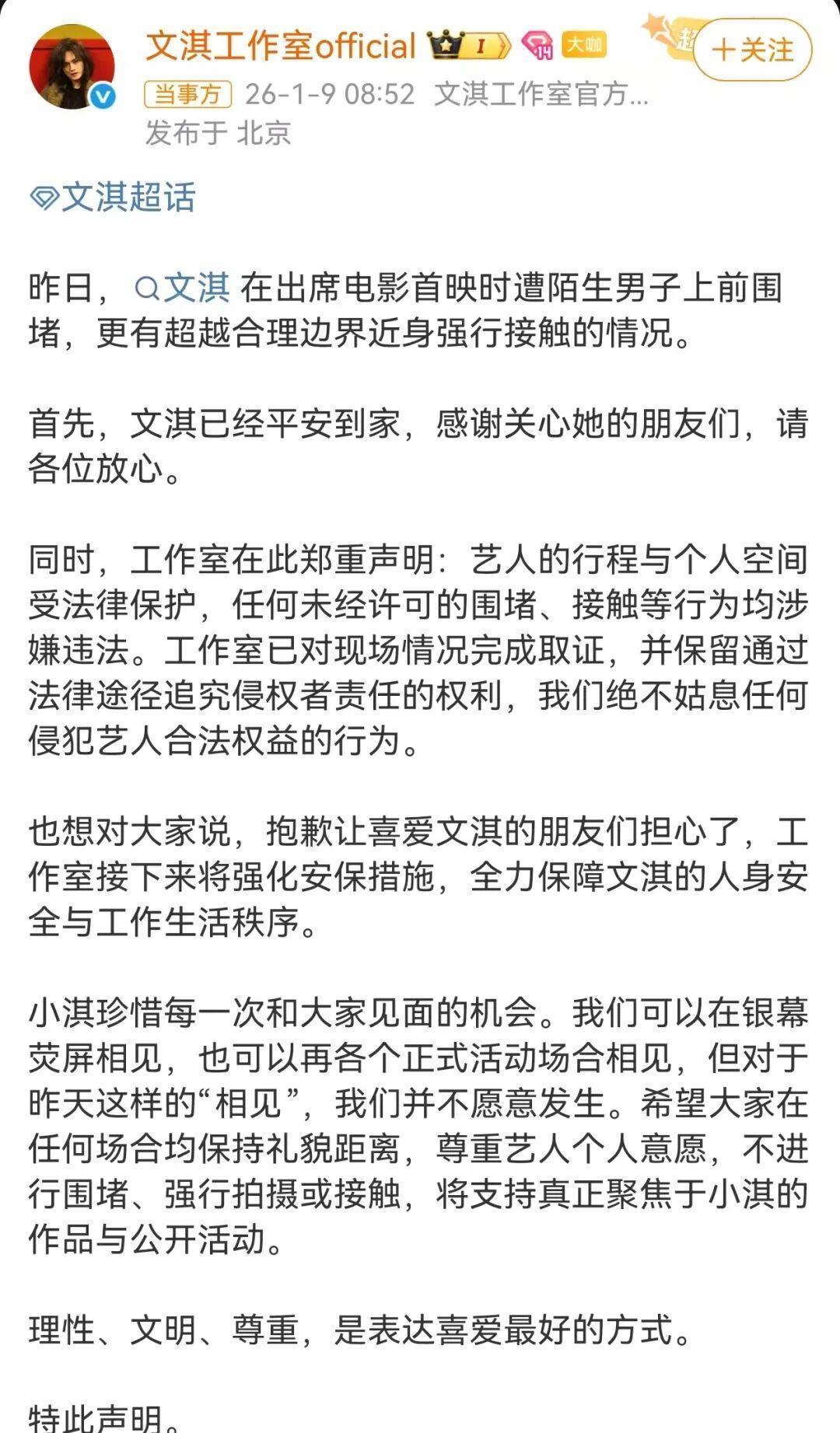 9日8时52分,文淇工作室官方账号发文,称文淇1月8日出席电影首映时遭陌生男子上前围堵,更有超越合理边界近身强行接触的情况。